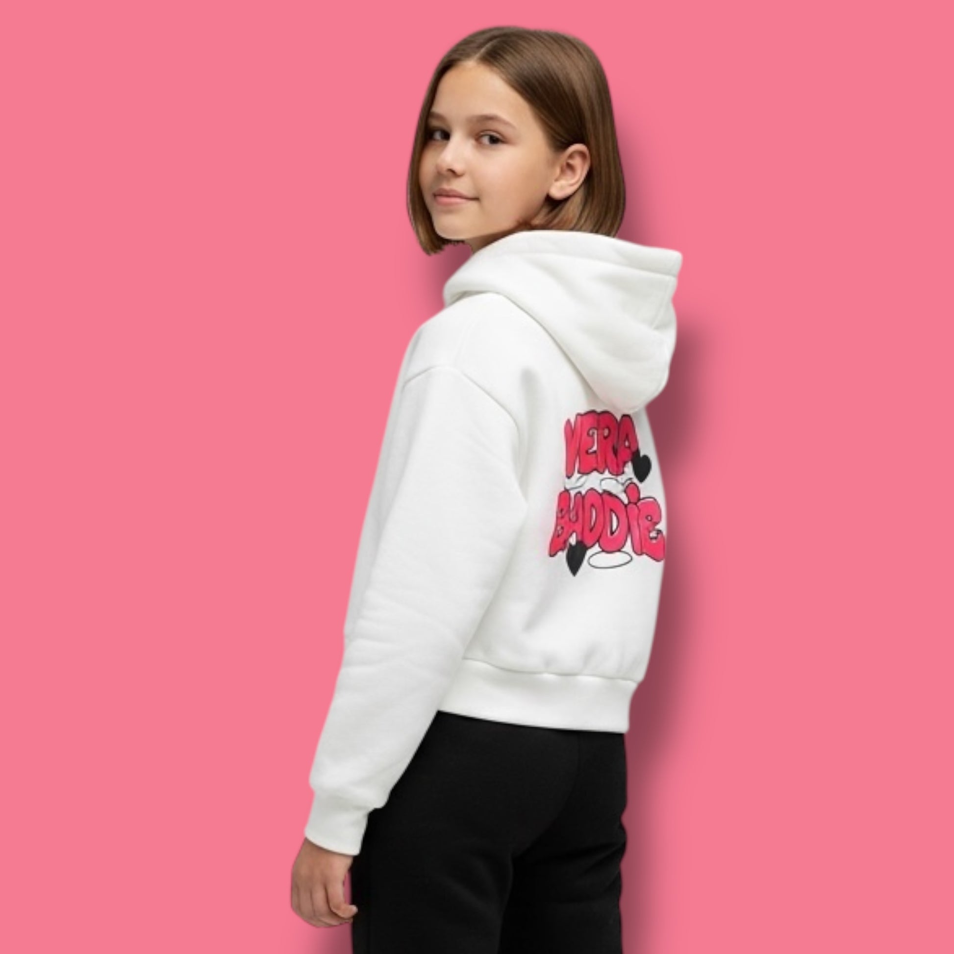 La felpa VERA BADDIE in fucsia è perfetta per uno stile casual e alla moda. Realizzata in morbido cotone felpato, presenta una stampa "VERA BADDIE" che aggiunge un tocco di personalità al tuo outfit. Ideale per le giornate più fredde, questa felpa ti terrà al caldo e alla moda.